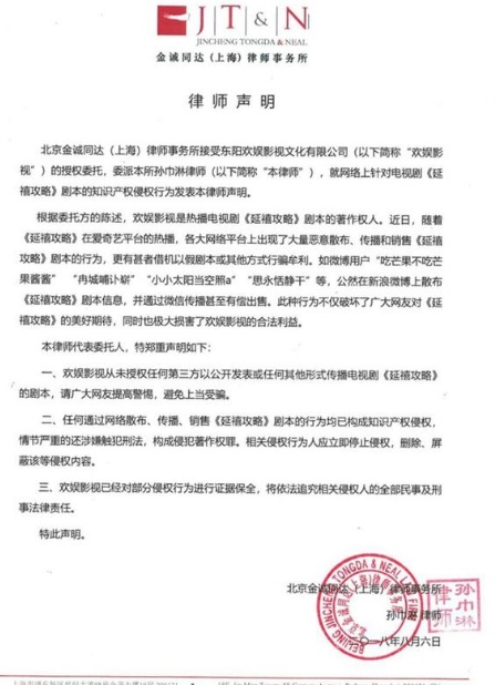 8月6日,《延禧攻略》官微发表律师声明,称近日在网络上出现大量恶意散布、传播和销售该剧剧本行为,更有甚者借机行骗牟利,极大地损害了欢娱影视的合法权益。声明还点名了“吃芒果不吃芒果酱酱”“冉城哺讣崭”“小小太阳当空照a””思永恬静干”等微博用户,称其公然在微博散布《延禧攻略》剧本信息,并通过微信传播并有偿出售。