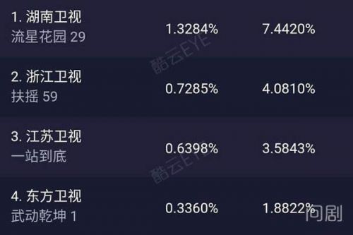 从该剧的首播情况来看,《武动乾坤》收视确实不怎么样。先不说和湖南卫视的《流星花园》首播破1%的成绩比,就连浙江卫视热播的杨幂《扶摇》首播都差得比较远。当初《扶摇》首播时,酷云实时收视最高点达到了0.6566%,最终平均收视0.5406%。而《武动乾坤》最高点达到了0.3944%,之后便一路下滑,最终平均收视0.3285%。