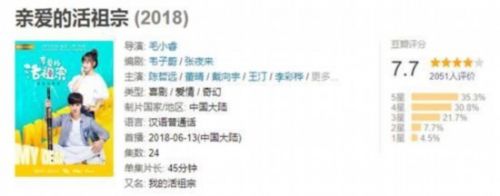 融入了穿越、外星人、生离死别的剧情虽然显得新奇脑洞大,但精心研磨的剧本、百里挑一的桥段、专门制作的配乐、敬业尽心的演员、精益求精的制作还是被观众认可,这些元素共同成就了一部好的作品,《亲爱的活祖宗》在豆瓣评分中喜提7.7分。
