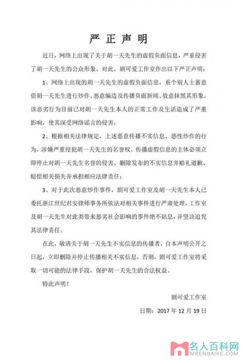 今天,其工作室针对近期网络上关于胡一天的不实传闻发出声明。称这些都是个别人士蓄意借胡一天进行炒作,恶意编造的负面新闻。要求必须删除不实信息并赔礼道歉,赔偿相关损失并承担相应的法律责任。