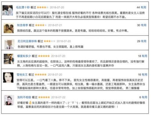 《延禧攻略》快节奏、无拖沓的剧情设置接近美剧标准,并通过强剧情的铺陈,推进故事主线迅速展开。剧中有富察皇后与魏璎珞之间的深厚情感,也有深宫众人的浮生百态,融合了友情、爱情、亲情等元素。不同于以往古装剧,《延禧攻略》女主自强聪慧的人设尤为亮眼,上线即受到了用户的好评“有胆识有魄力”“人心存良善,更应懂自保,对璎珞的三观不能再同意了 ”。此外,《延禧攻略》中的皇帝一开篇其毒舌和吐槽的人设就受到很多用户的青睐,剧中富察皇后、高贵妃及娴妃等人物在角色设定和演员精彩演绎的双重加持下,也备受用户好评。