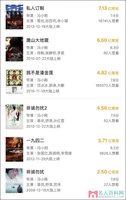 而在《芳华》之下,冯小刚的其他作品的票房排名前几名分别是: