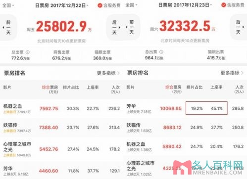 12月22日,陈凯歌执导的《妖猫传》、成龙主演的《机器之血》、邓超主演的《心理罪之城市之光》三部新片上映,首日分别收了7800万、7400万、6000万,开局都很不错。冯小刚早一周上映的《芳华》排片和票房受到压缩,当日只收了4500万。