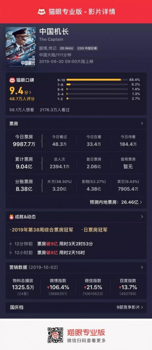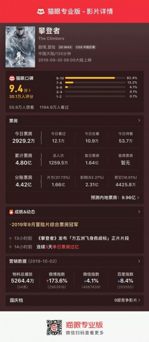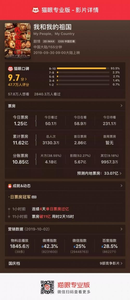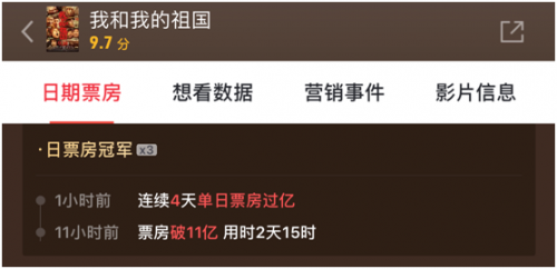猫眼电影专业版数据还显示,《我和我的祖国》票房已经连续4天“单日票房过亿”,累计票房突破11亿元仅用时2天15小时。