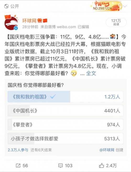 今天中午,环环也在微博上发起投票:国庆档,你觉得哪部最好看?截止目前,已有2.3万人参与投票。投票结果显示,《我和我的祖国》获1.2万人的支持,另有4401人选择了《中国机长》,974人投《攀登者》。 此外,有5313人选择了“小孩子才做选择我都爱”。