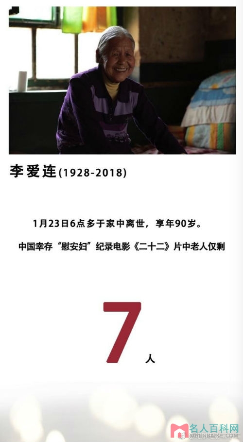 《二十二》是一部讲述日军侵华战争中,中国幸存“慰安妇”的长篇纪录片。今日,该片在微博宣布,片中出现的其中一位老人李爱连于23日去世,享年90岁。至此,影片中22位老人仅剩7位在世。
