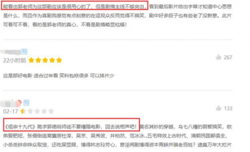 《祖宗十九代》的口碑好坏参半,正如郭德纲所说“两极分化”,毕竟喜剧,旨在搏观众一笑,数十位大咖的加盟,在阖家欢乐之际给大家带来欢乐,电影本身做到了。