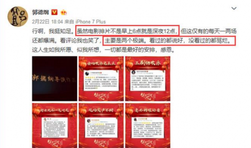 电影上映第八天也就是昨日票房正式突破1亿,虽然这对春节档的其他电影来说不值一提,但是对这部排片被极度压制的影片来说,值得庆祝,郭德纲、岳云鹏师徒纷纷在微博感谢支持的观众。