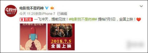 由文牧野执导,宁浩、徐峥共同监制的喜剧片《我不是药神》还有2天上映。今日,豆瓣评分已经开启,开局达到9.0分十分惊人!另外,电影官方微博还宣布《我不是药神》提档7月5日全国上映!一飞冲天,提前见效!