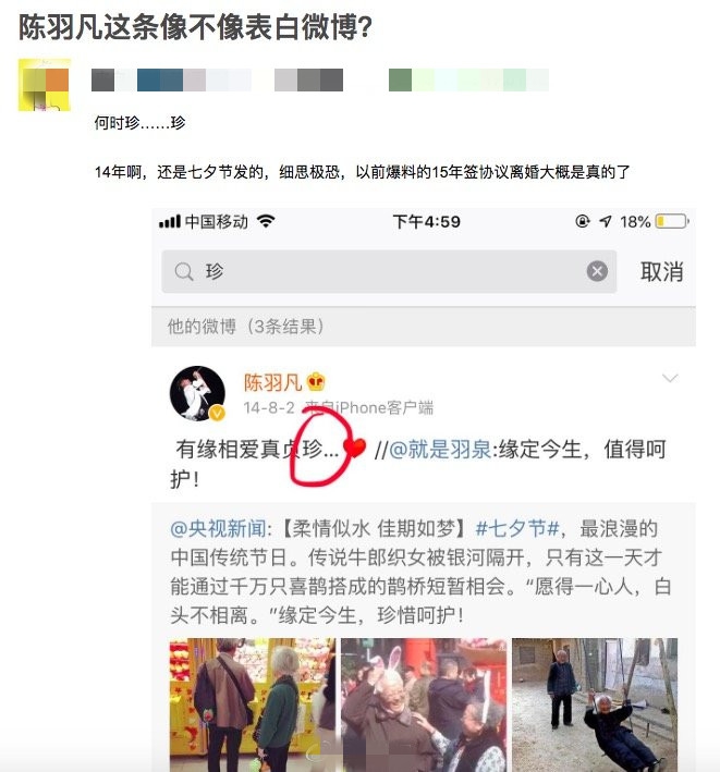 随后,有网友曝出一组陈羽凡与女生合照称是“何某某何时珍和陈羽凡的合影”,其后,有网友发现2014年七夕节陈羽凡发微博“有缘相爱真贞珍”带了女方名字,疑似证实爆料。