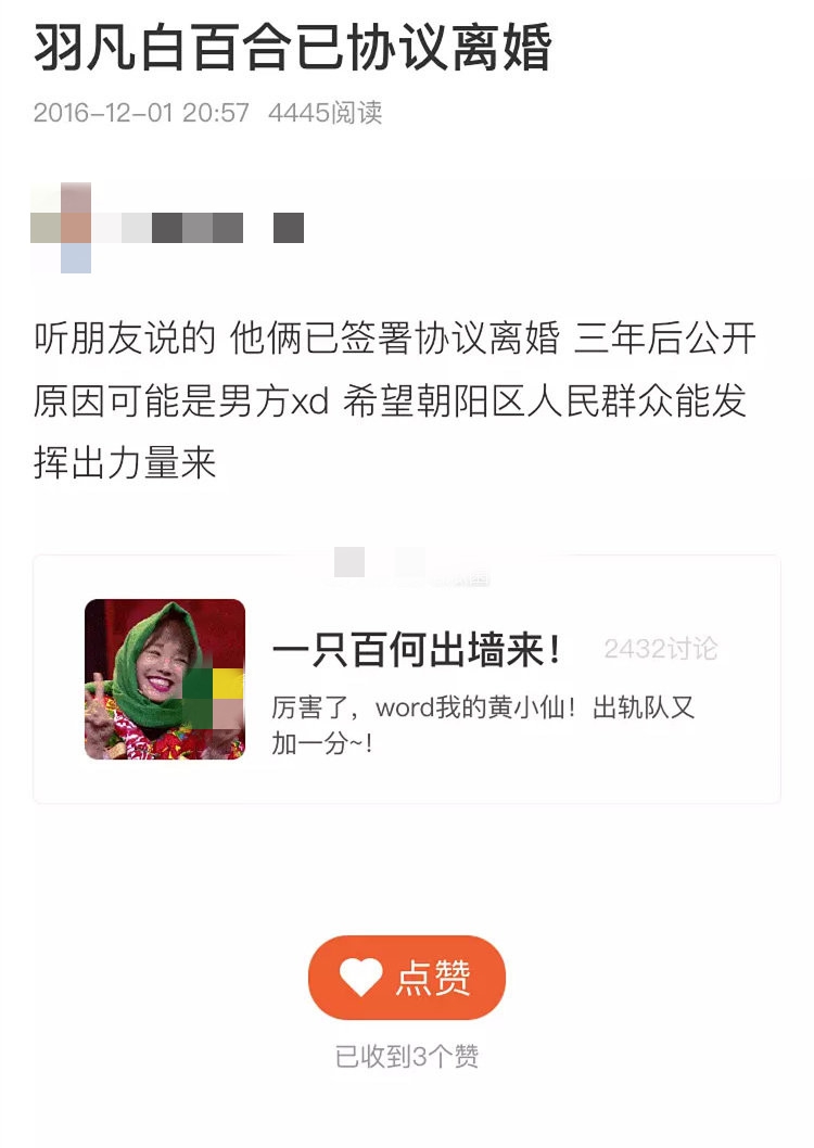 还有网友爆料称16年就有人爆料陈羽凡白百何已经离婚了,称“三年后公布,原因是男方xd。 ”