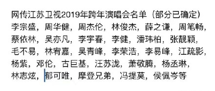有网友传出江苏卫视2019年跨年演唱会的名单图,其中包括周杰伦、林俊杰、薛之谦、吴亦凡等明星。12月1日,江苏卫视官博发布声明,否认网传跨年活动艺人名单,辟谣并保留追究法律责任的权利。