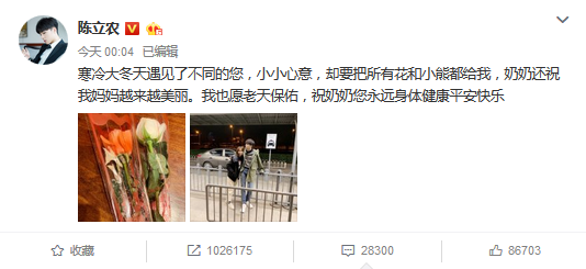 12月6日凌晨,陈立农发微博晒出与母亲的合照以及两枝花的照片,并配文,“寒冷大冬天遇见了不同的您,小小心意,却要把所有花和小熊都给我,奶奶还祝我妈妈越来越美丽。我也愿老天保佑,祝奶奶您永远身体健康平安快乐。”
