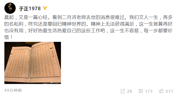编剧、制片人于正写道“看到二月河老师去世的消息很难过。我们文人一生,再多的名和利,终究还是要回归精神世界的。精神上无法获得满足,这一生就算再好也没有用,好好热爱生活热爱自己的这份工作吧,这一生不容易,每一步都要珍惜! ”