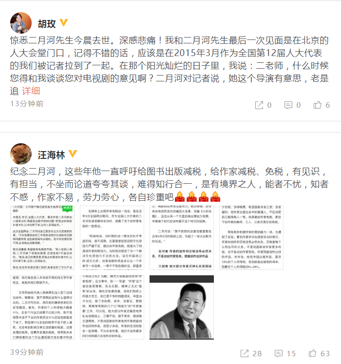 编剧汪海林写道“ 这些年他一直呼吁给图书出版减税,给作家减税、免税,有见识,有担当,不坐而论道夸夸其谈,难得知行合一,是有境界之人,能者不忧,知者不惑,作家不易,劳力劳心,各自珍重吧。”