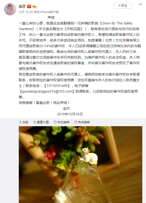 16日,金莎在自己微博发布声明,寻找歌曲《Down By The Salley Gardens》的著作权人。她表示:“一直以来的心愿,就是此生能翻唱我一见