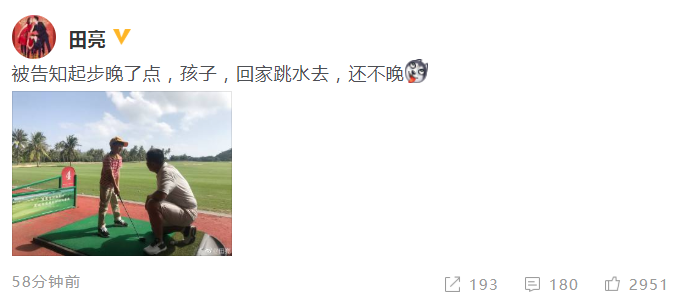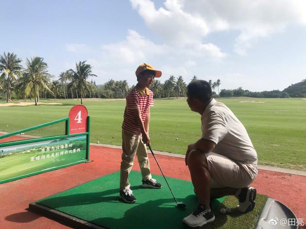 12月19日晚,田亮通过微博晒出儿子小亮仔打高尔夫球的照片,并配文写道:“被告知起步晚了点,孩子,回家跳水去,还不晚。”照片中,小亮仔戴着黄色棒球帽,身穿红白条纹T恤,双手拿着球杆,在教练的指导下学习打高尔夫球,姿势帅气,也听得非常的认真。
