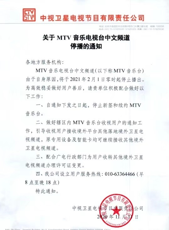 近日,中视卫星电视责任有限公司发出公告,宣布MTV中文台将于2月1日停播。据悉,MTV音乐电视频道中文台是台湾地区最受欢迎的音乐频道,同时也是15至34岁年轻人第一个想到的电视音乐频道。