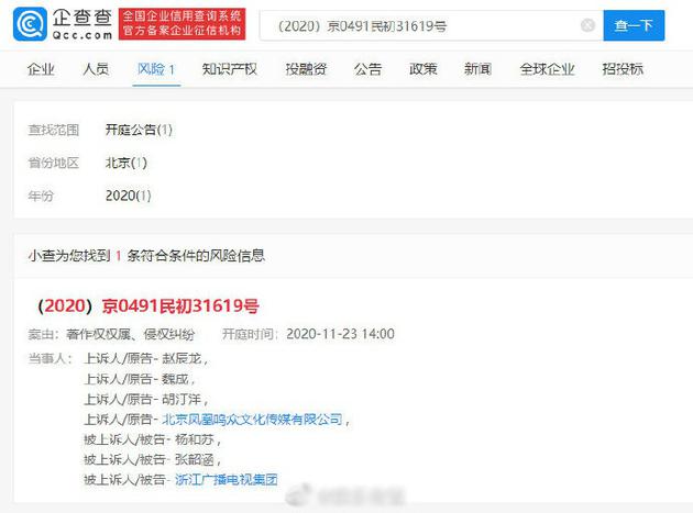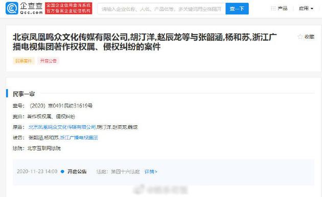据企查查,南征北战与其相关公司将张韶涵、杨和苏、浙江广播电视集团告上法庭,首次开庭时间为11月23日,涉及案由为著作权权属、侵权纠纷。