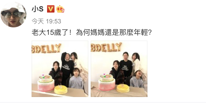1月10日,小S晒出两张为大女儿许曦文庆祝15岁生日的照片,还说道:“老大15岁了!为何妈妈还是那么年轻?”