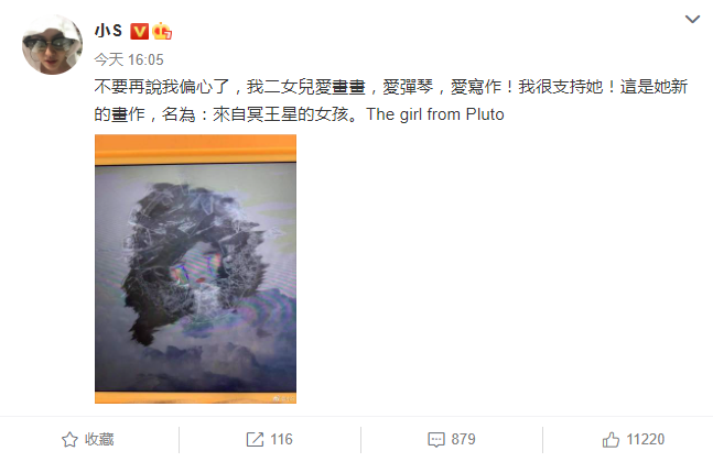 12月23日下午,小S晒出二女儿的画作,回应道:“不要再说我偏心了,我二女儿爱画画,爱弹琴,爱写作!我很支持她!这是她新的画作,名为:来自冥王星的女孩。The girl from Pluto ”。