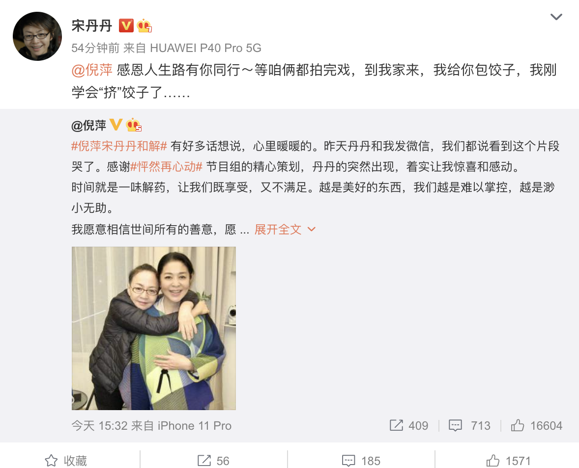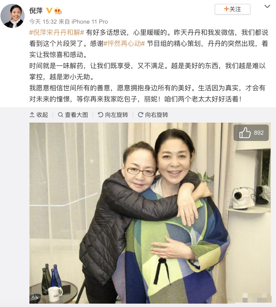 1月28日,《怦然再心动》第二期节目中,征爱主理人倪萍与飞行嘉宾宋丹丹以一个世纪拥抱,化解了二十年的矛盾,“我们一直都是最好的朋友,你说我惹过你,可真是冤死我了”,倪萍哽咽着对宋丹丹说;宋丹丹提起往事表示“倪萍人挺好,就是说话太直”,倪萍也为自己以前的行为表示道歉,两人还当场加上了微信。