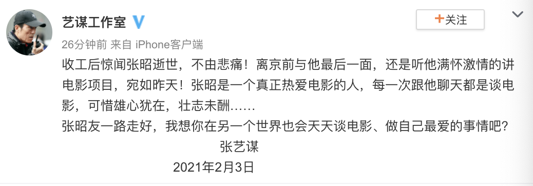 2月3日,原乐视影业CEO及执行董事张昭去世,终年58岁。张艺谋通过工作室发文悼念,“收工后惊闻张昭逝世,不由悲痛!离京前与他最后一面,还是听他满怀激情的讲电影项目,宛如昨天!张昭是一个真正热爱电影的人,每一次跟他聊天都是谈电影,可惜雄心犹在,壮志未酬……张昭友一路走好,我想你在另一个世界也会天天谈电影、做自己最爱的事情吧?——张艺谋”。