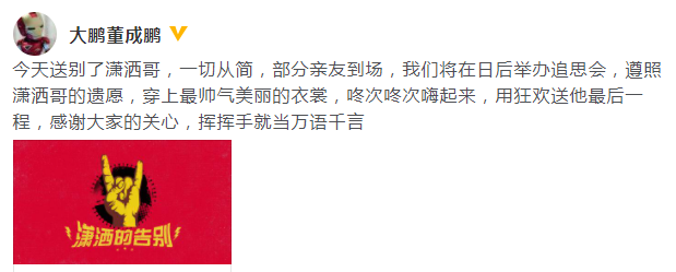 赵英俊追悼会今日举行。随后,大鹏董成鹏发文送别赵英俊,并透漏将举办追思会。他称:“今天送别了潇洒哥,一切从简,部分亲友到场,我们将在日后举办追思会,遵照潇洒哥的遗愿,穿上最帅气美丽的衣裳,咚次咚次嗨起来,用狂欢送他最后一程,感谢大家的关心,挥挥手就当万语千言 。”