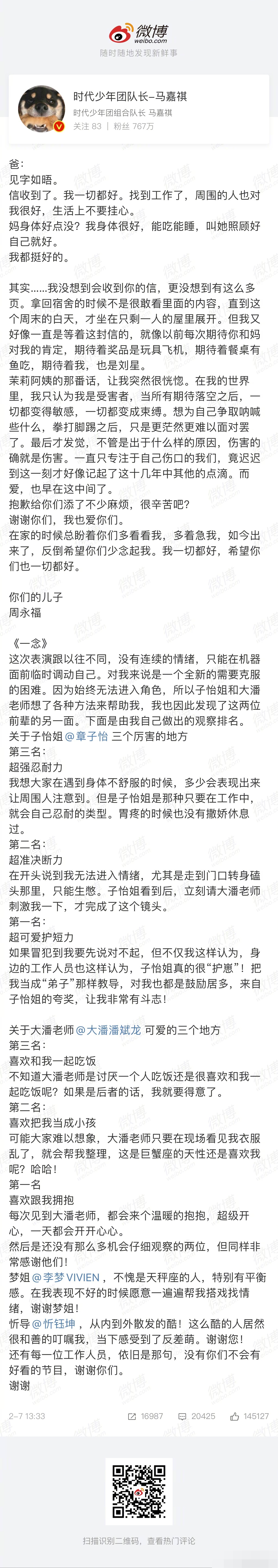 网友们看到马嘉祺的长文,也都纷纷表示鼓励:“小马真的很真挚一孩子,努力一定会有回报的。”“宝贝你真的超级超级超级棒,每个角色都塑造的很好,每次看你表演都会被感动。希望以后可以看到宝贝更多的作品,演员马嘉祺未来可期!小马快跑,不怕跌倒!”