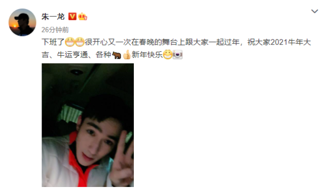随后,朱一龙晒出自己的加班照,表示很开心又在春晚无爱和大家一起过年。