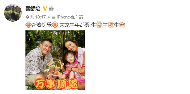 2月12日,陈冠希老婆秦舒培在微博晒出一家人新年合照,陈冠希穿着清凉,碎花衬衫清爽帅气,秦舒培披散着长发,穿着条纹上衣,怀里抱着女儿。Alaia扎着冲天辫,穿着粉红色碎花小裙子,冲镜头抿嘴笑,一家三口席地而坐,画面温馨又有爱。并配文:“新春快乐,大家牛年都要牛牛牛。”。