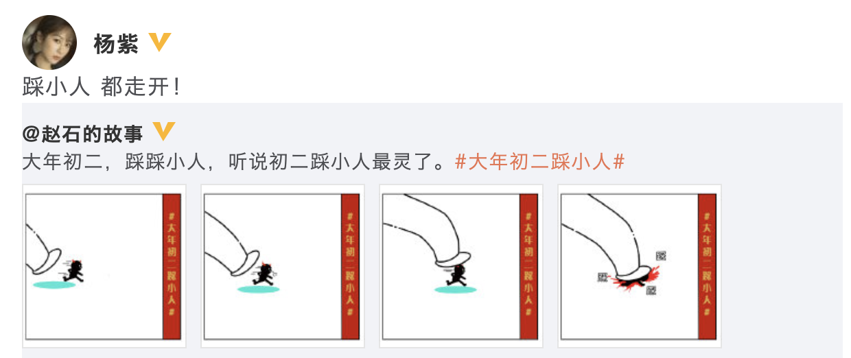 2月13日是牛年大年初二,网上有不少网友转发“大年初二踩小人”的动态,杨紫也加入其中,配文“踩小人 都走开!”该动态发出后,粉丝积极互动,“哈哈哈我来帮老公踩一踩!!!”“走开走开都走开!!!”还有粉丝以为杨紫切错号,“姐?我还以为刷错了”。