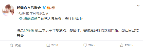近日有网友爆料张艺兴与杨紫恋爱中,即将官宣。22日,杨紫官方后援会在社交平台上发文辟谣恋情传闻,称:“目前艺人是单身,专注拍戏中~演员杨紫最近表示今年想演戏,想创作,尝试更多好的戏和作品,想让自己忙碌些~ ”