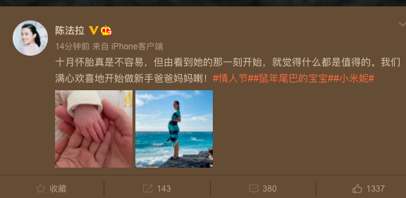 2月14日,陈法拉晒出一家三口握手照宣布生女喜讯:“十月怀胎真是不容易,但由看到她的那一刻开始,就觉得什么都是值得的。我们满心欢喜地开始做新手爸爸妈妈喇!”据悉,去年5月21日,陈法拉晒出与老公Emmanuel Straschnov戴着戒指牵手的照片,宣布结婚。恭喜!