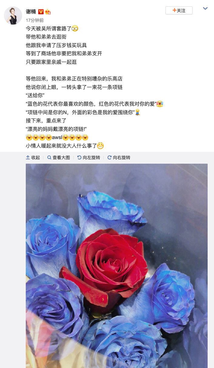 2月14日,谢楠晒出大儿子吴所谓给自己送的情人节礼物,并表示“小情人暖起来就没大人什么事了”。谢楠发文:今天被吴所谓套路了,带他和弟弟去逛街,他跟我申请了压岁钱买玩具,等到了商场他非要把我和弟弟支开,只要跟家里亲戚一起逛。等他回来,我和弟弟正在特别嘈杂的乐高店,他说你闭上眼,一转头拿了一束花一条项链,“送给你,蓝色的花代表你最喜欢的颜色,红色的花代表我对你的爱,“项链中间是你的N,外面的彩色是我的爱围绕你”。接下来,重点来了,“漂亮的妈妈戴漂亮的项链!”,小情人暖起来就没大人什么事了。