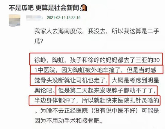 2月14日,有网友爆料称,自己的家人在三亚偶遇女星陶虹,当时陶虹是在徐峥和徐峥妈妈以及孩子的陪同下去医院就医。原因是陶虹前一天被一辆外地车给撞了,当时感觉骨头没断就让司机走了,但第二天起来时发现脖子不能动了,而且半边身体都肿了,于是赶快来到中医院扎针灸治疗。