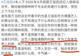 更让粉丝更加接受不了的是,经纪人杨柳对自己和王俊凯的关系表达很模糊,透露着一股暧昧的气息,在参见活动时,不懂得和艺人保持距离,故意让粉丝误会,甚至还有营销号造谣王俊凯在和经纪人谈恋爱。即使工作室最后予以否定,但还是给王俊凯及其粉丝造成了困扰。