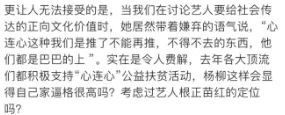 粉丝称杨柳作为经纪人看不上各大顶流都在力推的公益项目,在粉丝放出的谈论录音中,杨柳认为自己没有错误,还表明自己的艺人最厉害,“心连心”是一个推了不能再推的工作而已。