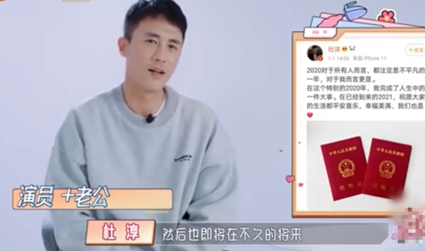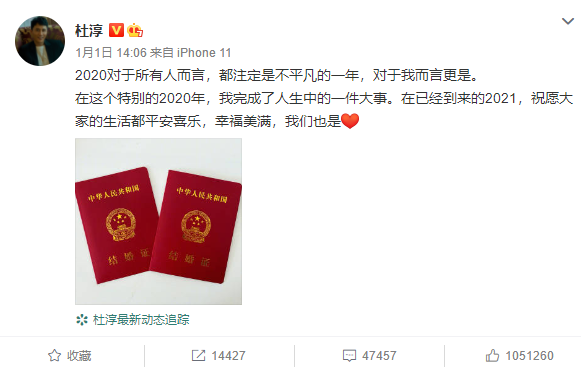 此前在1月1日,杜淳曾晒出结婚证宣布结婚喜讯。