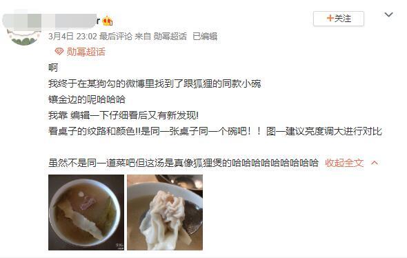 3月4日,杨幂和魏大勋的一名“CP粉”发文称自己在魏大勋的微博内,找到了与杨幂同款的小碗,而且这个小碗还是镀金边的。不仅如此,这位“CP粉”还通过对比发现,两人晒出的照片中的桌子纹路和颜色也是同一张。并且建议想要求真相的网友,将第一张图片颜色调亮后对比,会更加明显。