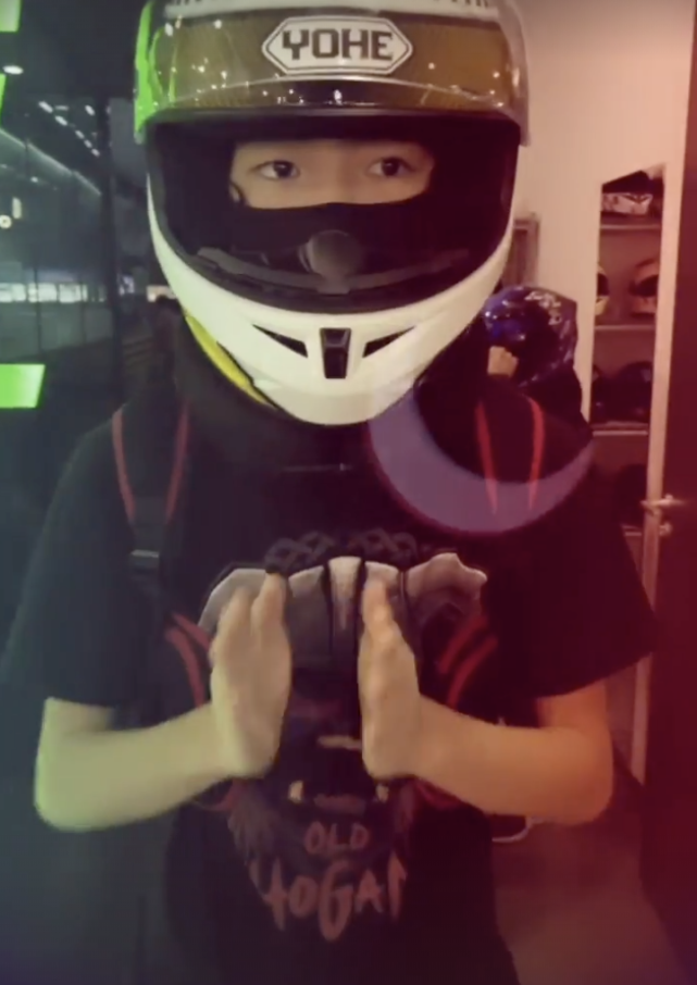 随后,大儿子Lucas戴好了头盔,只露出来一双眼睛,拍着手跃跃欲试,和妈妈对话的声音比较低沉,13岁的他显然已经到了变声期。