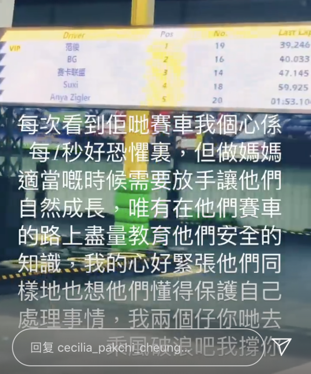 张柏芝坦言自己心里是非常担心他们的,但是必须学会放手,让他们自然成长,唯有在赛车路上尽量教育他们安全知识,让他们懂得保护自己。