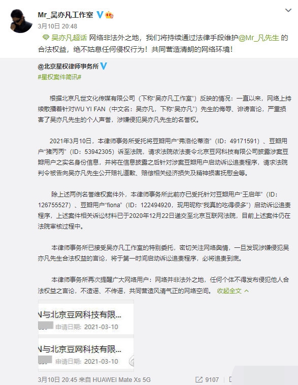 3月10日晚,北京星权律师事务所发布案情简讯称:有部分网络用户在网络上持续散播着针对吴亦凡的侮辱、诽谤言论,严重损害了吴亦凡先生的个人声誉,涉嫌侵犯吴亦凡先生的名誉权。律师事务所受托将发布诽谤言论的用户诉至法院并已启动诉讼追责程序,请求法院判令被告向吴亦凡先生公开赔礼道歉、赔偿相关经济损失及精神损害抚慰金等。