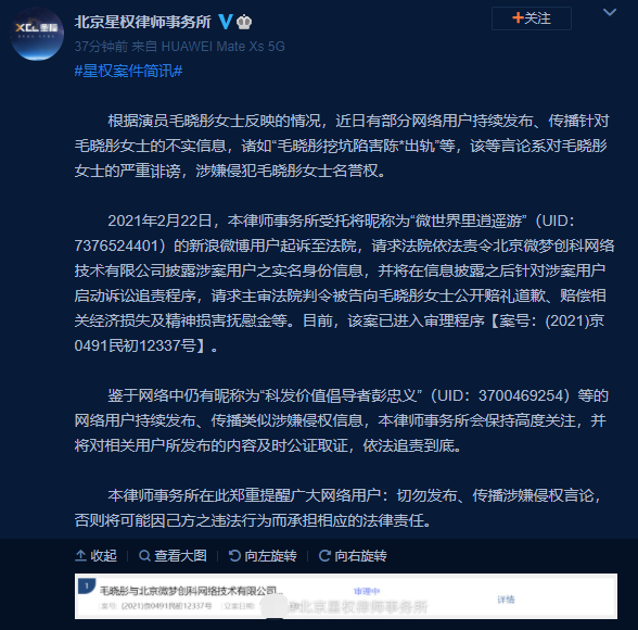 3月10日,毛晓彤方通过律师事务所发布案件简讯,表示近日有部分网络用户持续发布、传播针对毛晓彤女士的不实信息,诸如“毛晓彤挖坑陷害陈*出轨”等,律师事务所已将侵权用户起诉至法院,并持续对相关用户依法取证。