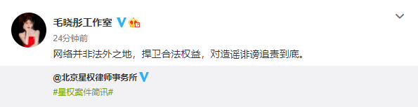 随后,毛晓彤工作室转发表示:“网络并非法外之地,捍卫合法权益,对造谣诽谤追责到底。”