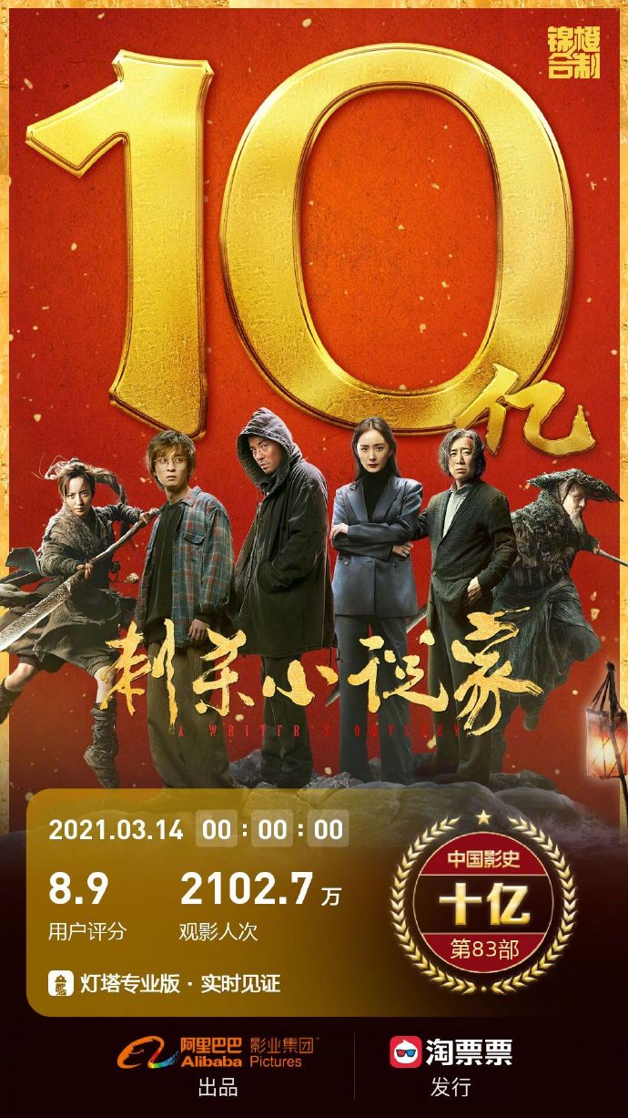 截至3月14日0时,雷佳音、杨幂、董子健等主演的《刺杀小说家》总票房超过10亿元,成为中国影史第83部票房破10亿电影。