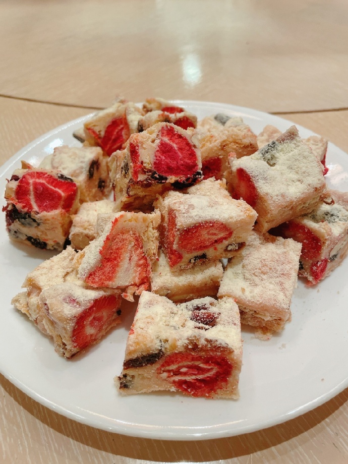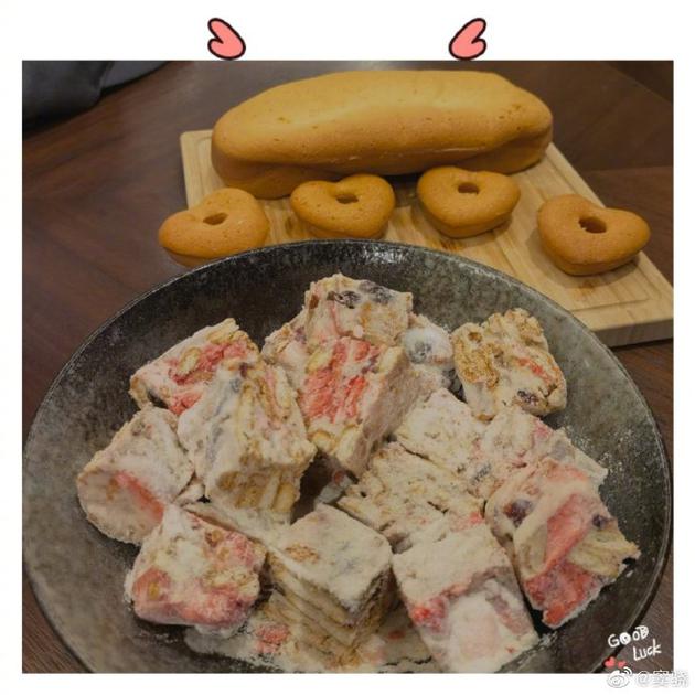 另一张照片里是何超莲亲手做得雪花酥照片,色彩鲜艳,令人食欲大增。