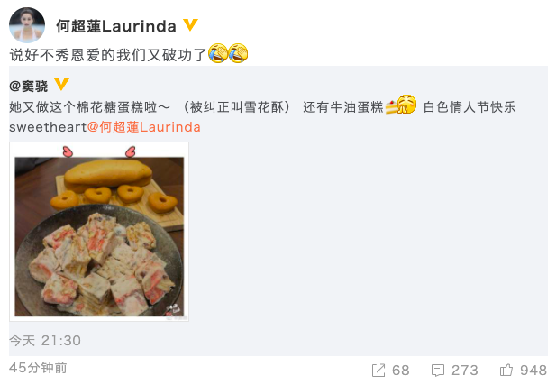 3月14日是白色情人节,窦骁在微博晒出女友何超莲做的棉花糖蛋糕(何超莲纠正叫雪花酥)和牛油蛋糕祝大家白色情人节快乐,甜喊女友“Sweet heart”。