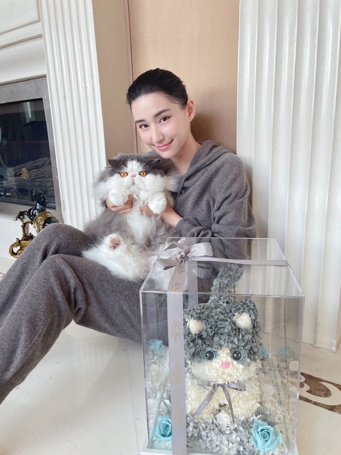 照片中何超莲身穿灰色运动服现身,抱着猫咪,旁边放着窦骁送的永生花猫咪,看起来十分甜蜜。