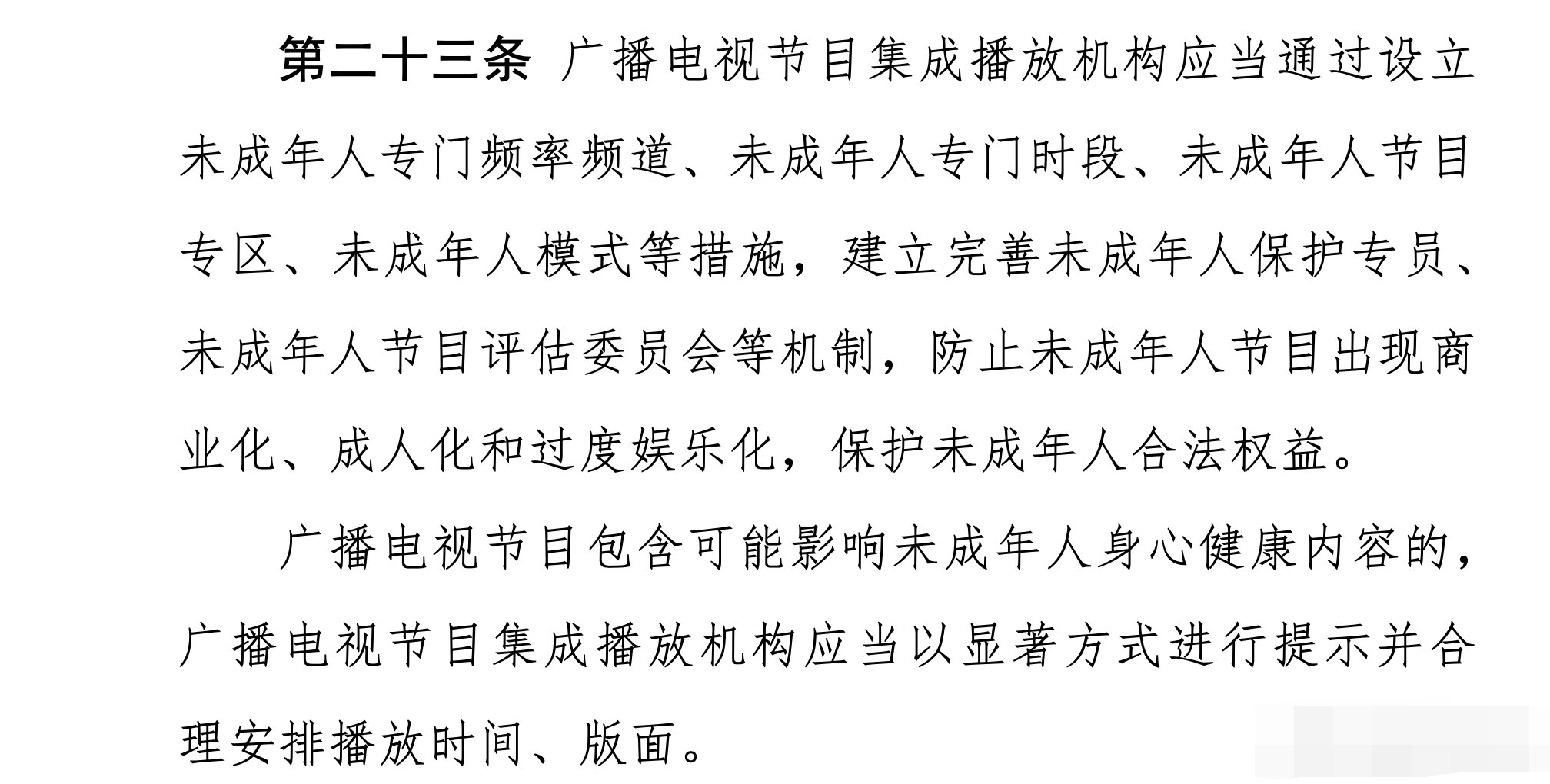 征求意见稿指出,广播电视节目集成播放机构应当通过设立未成年人专门频率频道、未成年人专门时段、未成年人节目专区、未成年人模式等措施,建立完善未成年人保护专员、未成年人节目评估委员会等机制,防止未成年人节目出现商业化、成人化和过度娱乐化,保护未成年人合法权益。
